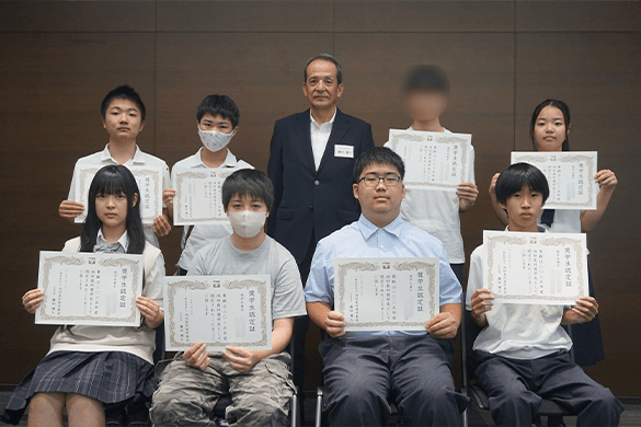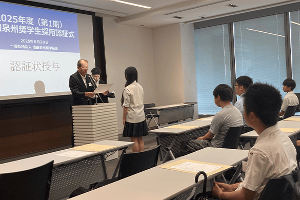 認証式では、第1期池田泉州奨学生となる高校生たち一人ひとりに、藤田代表理事より奨学生認定証を授与させて頂きました。